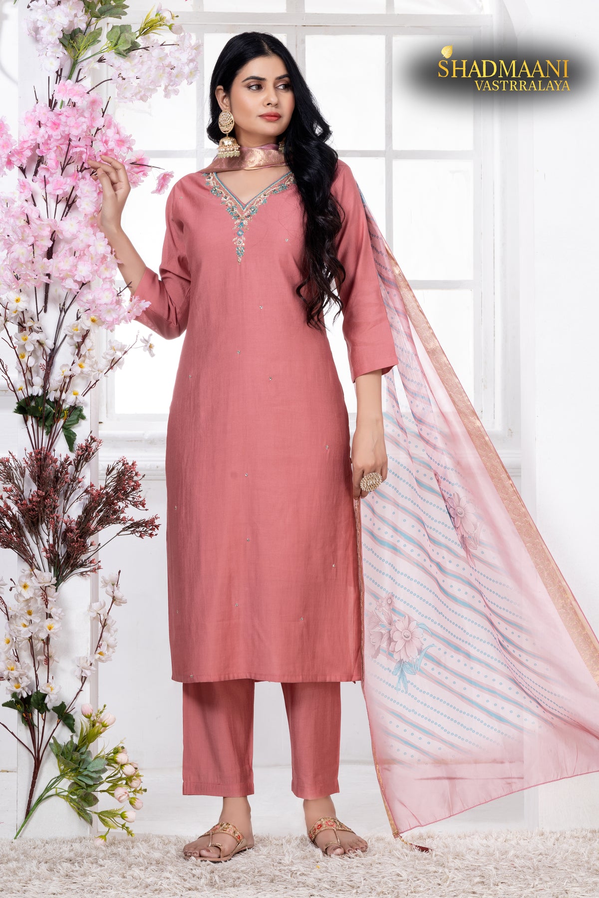 Roman silk top with embroidery neck work and floral printed silk dupatta
