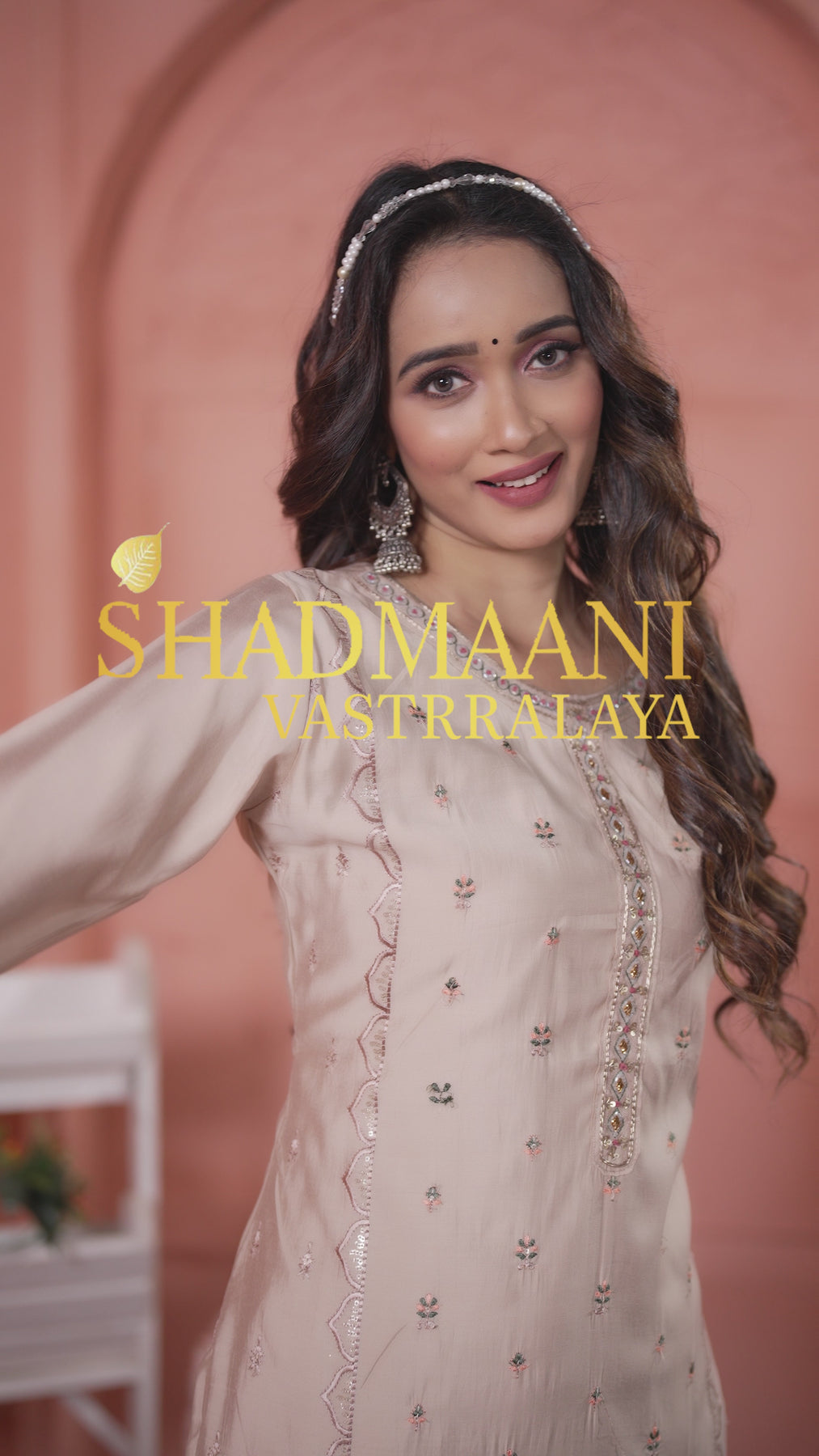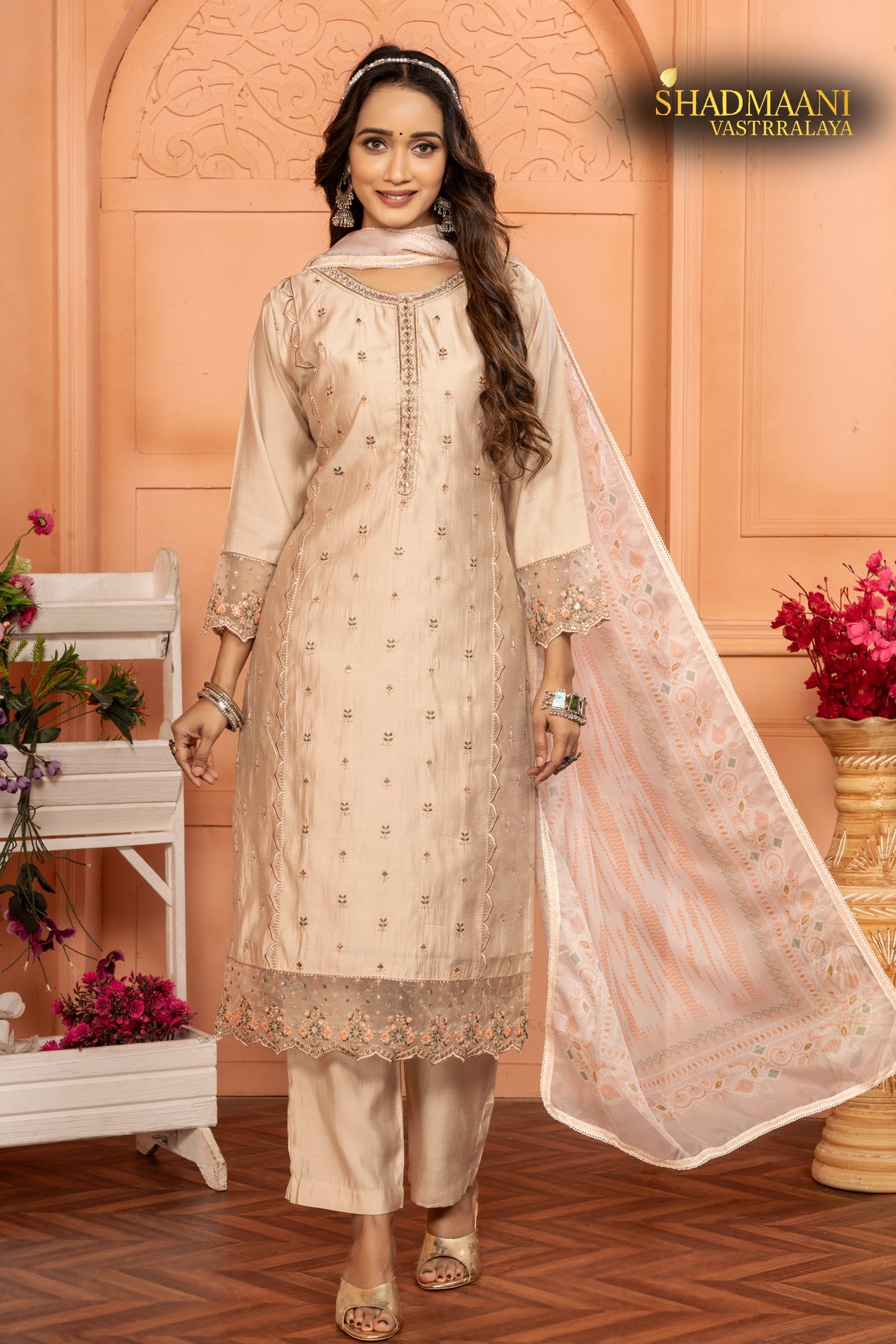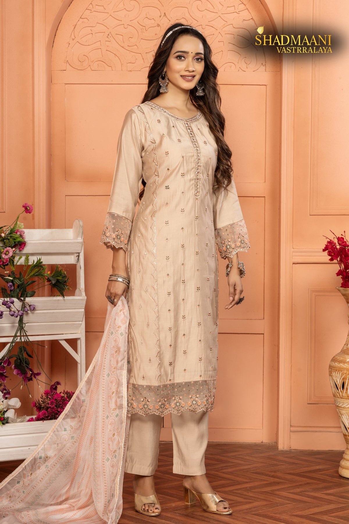 The 3-piece beige colour silk suit set is embellished with hand embroidered throughout top accompanied with lace work silk dupatta and silk pant