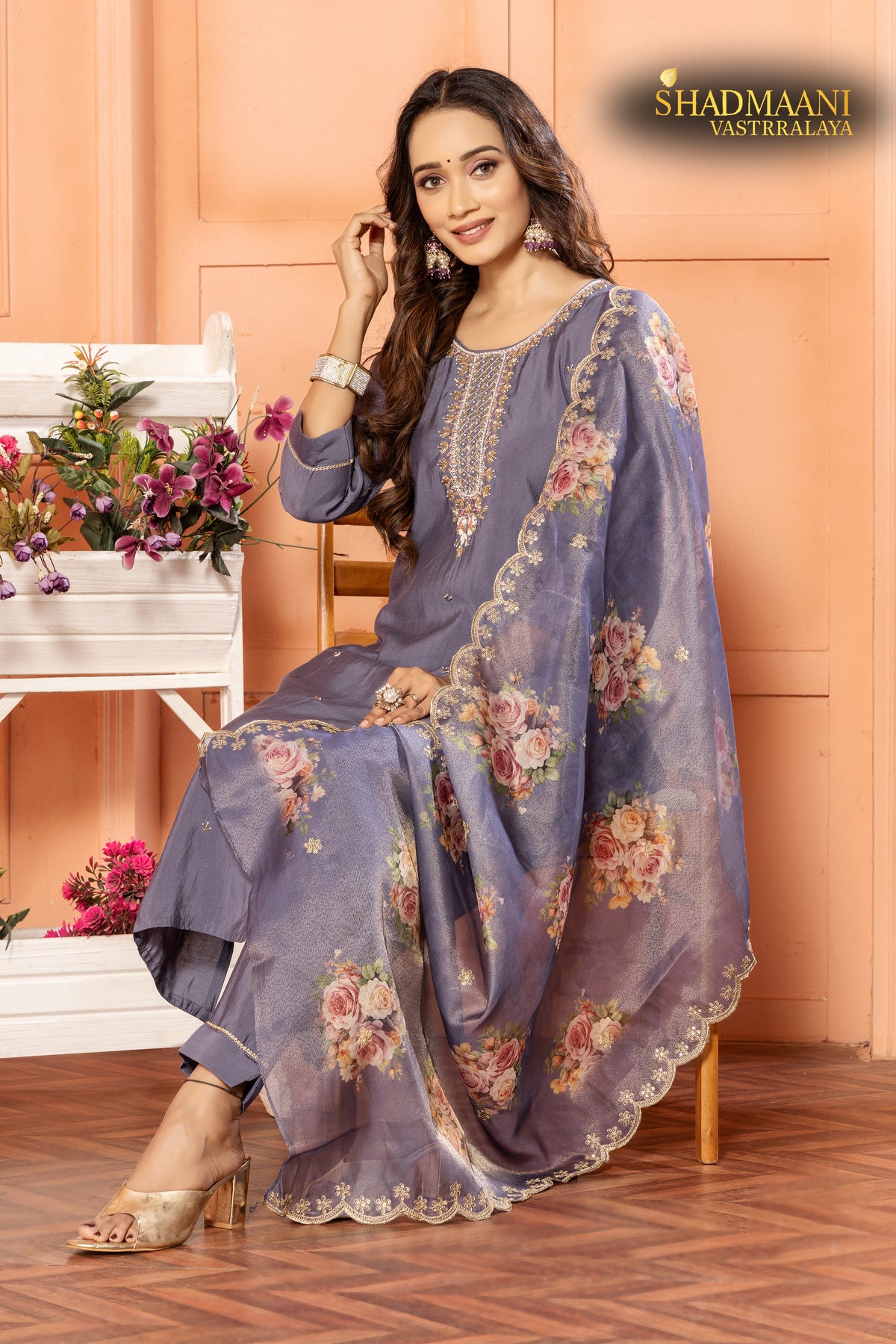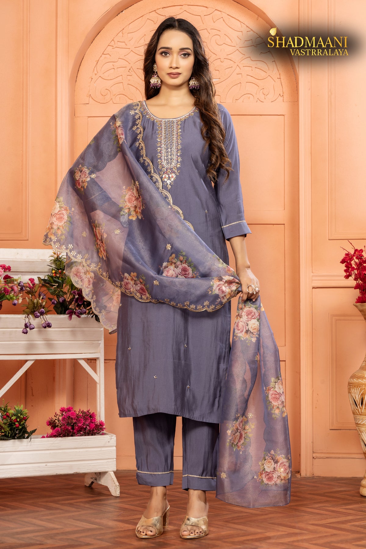 One of the rare shades of blue colour silk suit has mesmerizing work around neck with organza shimmery floral dupatta.