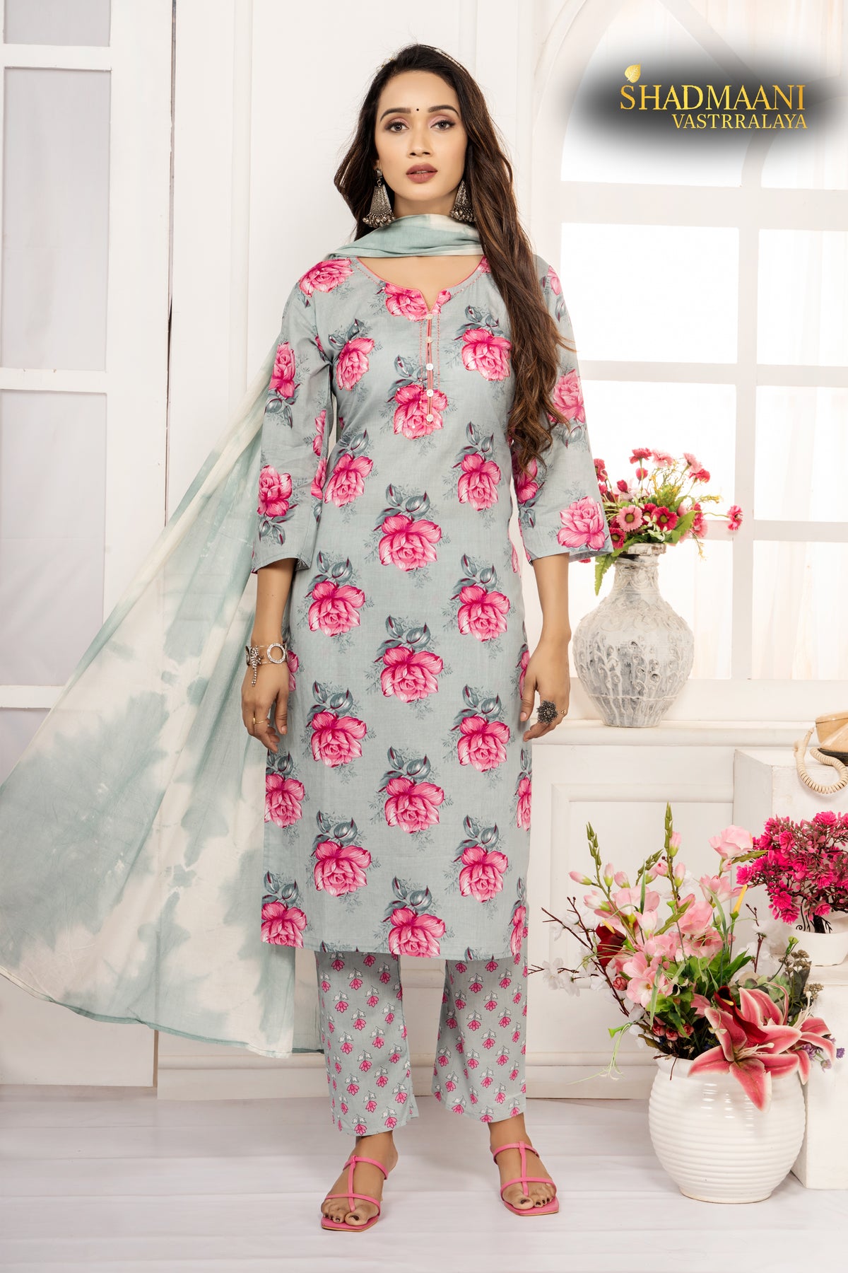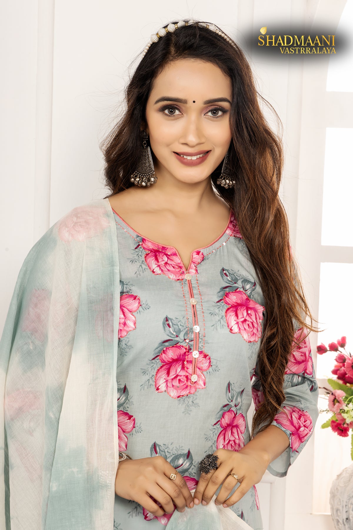 Cotton is all time favourite in any season, light to anyone whole handles it. The grey colour suit has got flowers and petals print in it and designed pant with soft cotton dupatta