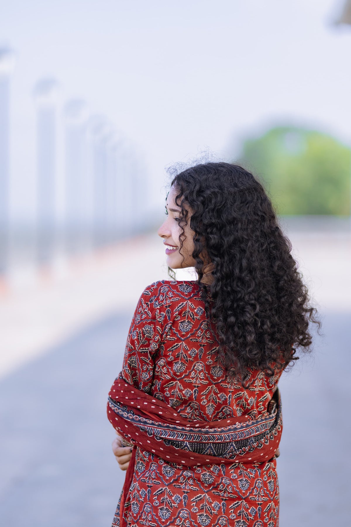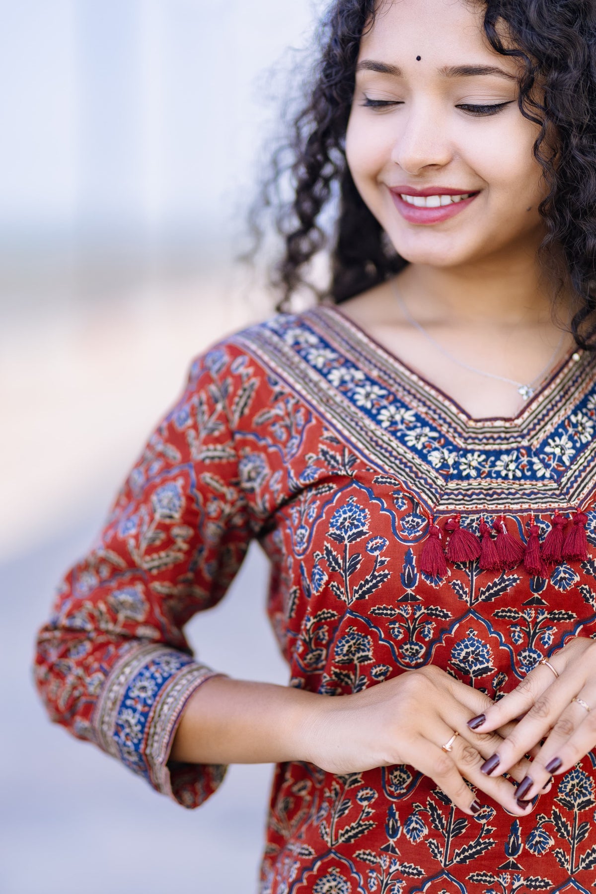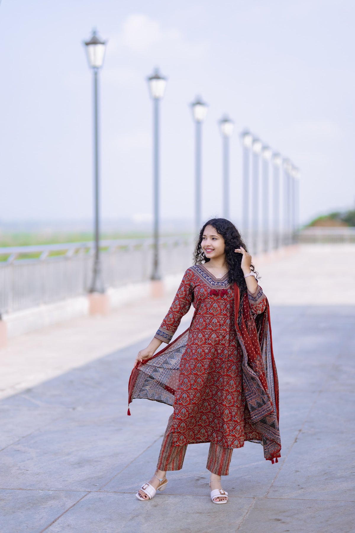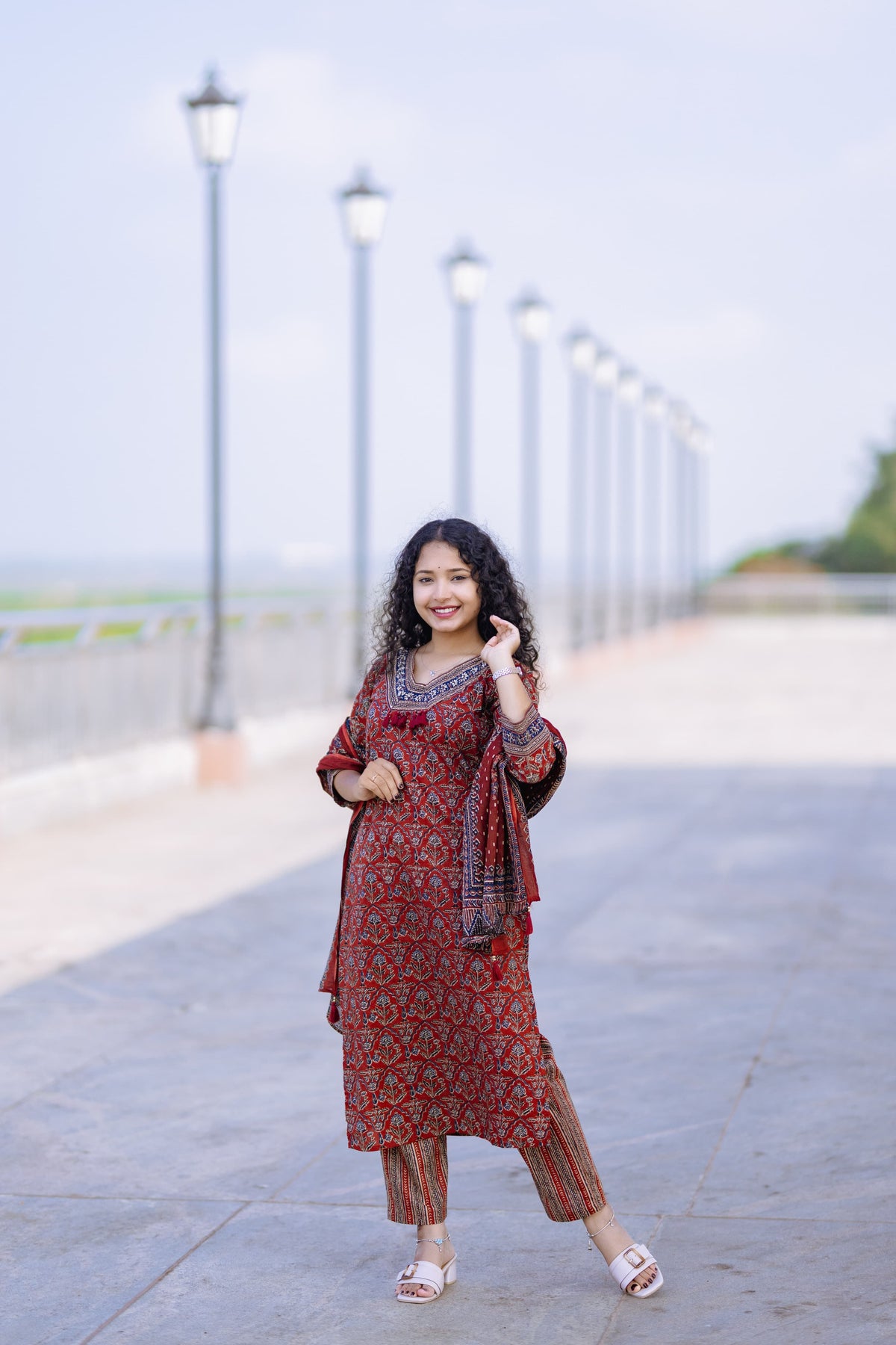 This maroon colour suit bring love from united colours of yellow, blue & red.