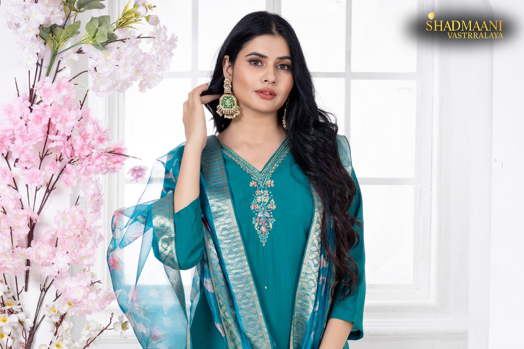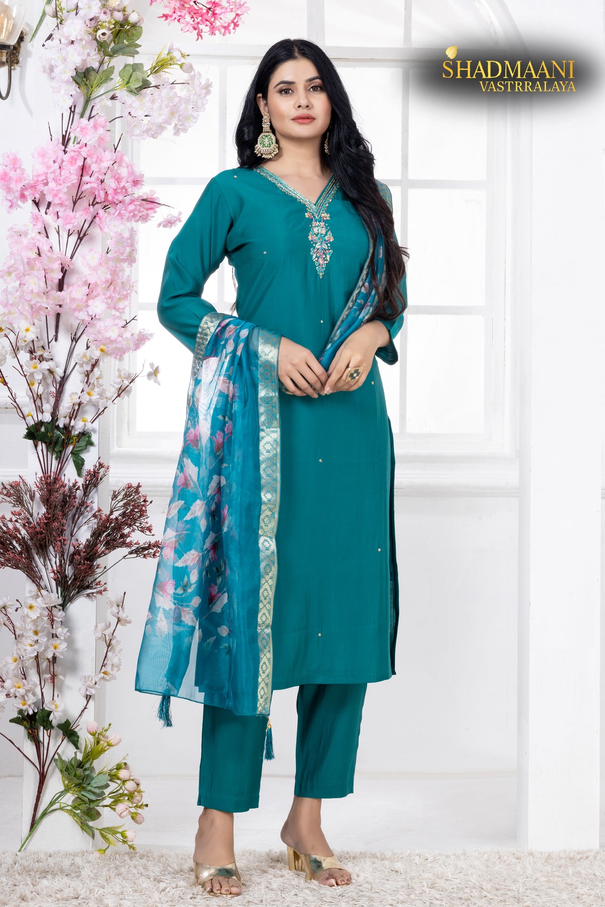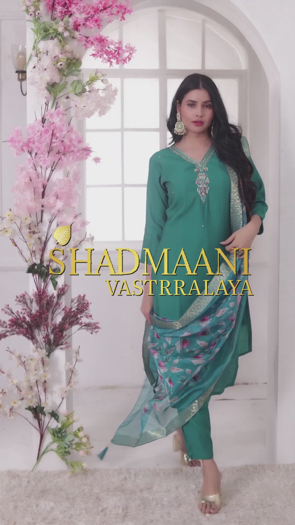 Beautiful piece of well stitched elegant emerald colour silk suit. It' has got attractive embroidery work on the neck accompanied with printed dupatta.
